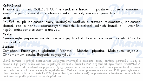 Thajská tygří mast GOLDEN CUP je vyrobena tradičními postupy pouze z přírodních surovin a její příznivý vliv na zdraví člověka jí zajistily světovou proslulost.