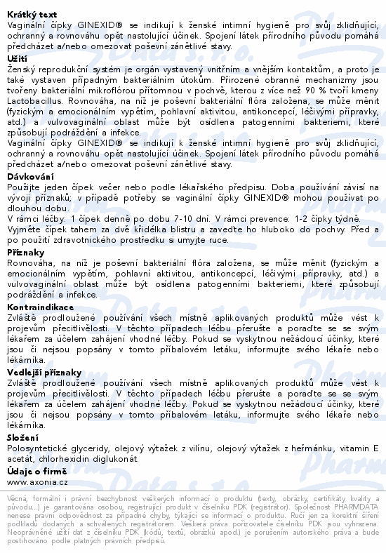 Vaginální čípky GINEXID® se indikují k ženské intimní hygieně pro svůj zklidňující, ochranný a rovnováhu opět nastolující účinek. Spojení látek přírodního původu pomáhá předcházet a/nebo omezovat poševní zánětlivé stavy.