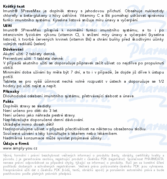 Imunit® 5PreveMax je doplněk stravy s jahodovou příchutí. Obsahuje nukleotidy chlorelly a beta-glukany z hlívy ústřičné. Vitaminy C a B6 pomáhají udržovat správnou funkci imunitního systému. Kyselina listová snižuje míru únavy a vyčerpání.