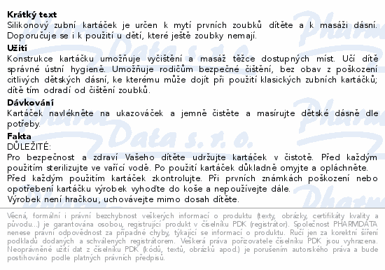 Silikonový zubní kartáček je určen k mytí prvních zoubků dítěte a k masáži dásní. Doporučuje se i k použití u dětí, které ještě zoubky nemají.