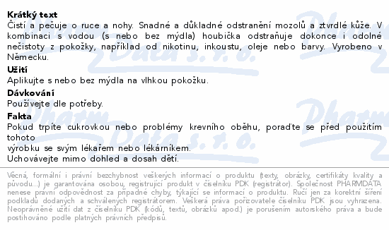 Čistí a pečuje o ruce a nohy. Snadné a důkladné odstranění mozolů a ztvrdlé kůže. V kombinaci s vodou (s nebo bez mýdla) houbička odstraňuje dokonce i odolné nečistoty z pokožky, například od nikotinu, inkoustu, oleje nebo barvy. Vyrobeno v Německu.