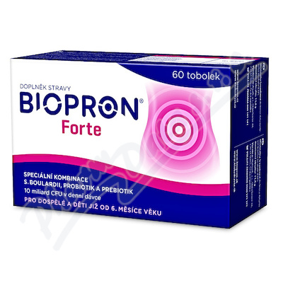 BIOPRON Forte obsahuje speciální kombinaci probiotických bakterií (Lactobacillus acidophilus, Lactobacillus rhamnosus) a probiotických kvasinek Saccharomyces boulardii doplněnou o prebiotické fruktooligosacharidy.