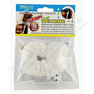 Repelentní Trixline gumička proti vším obsahující rozmarýn, eukalyptus, mátu peprnou, geraniol. Výrobek je voděodolný.