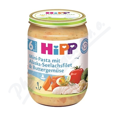 Masozeleninový příkrm HiPP Mini těstoviny s aljašskou treskou v máslové zelenině, pro děti od uk. 5. měsíce. Obsahuje omega-3 mastné kyseliny pro vývoj mozku a nervových buněk. Bez přídavku soli, obsahuje lepek.