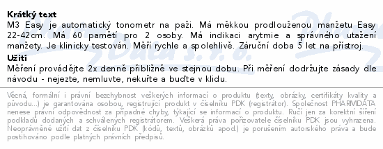 M3 Easy je automatický tonometr na paži. Má měkkou prodlouženou manžetu Easy 22-42cm. Má 60 pamětí pro 2 osoby. Má indikaci arytmie a správného utažení manžety. Je klinicky testován. Měří rychle a spolehlivě. Záruční doba 5 let na přístroj.