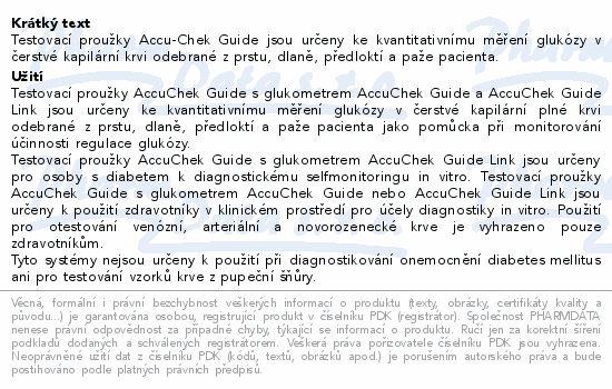 Testovací proužky Accu-Chek Guide jsou určeny ke kvantitativnímu měření glukózy v čerstvé kapilární krvi odebrané z prstu, dlaně, předloktí a paže pacienta.