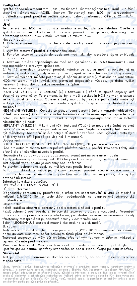 Zjistěte pohodlně a v soukromí, jestli jste těhotná. Těhotenský test hCG slouží k zjištění včasného těhotenství. ADIEL Seenow Těhotenský test hCG je zdravotnickým prostředkem, před použitím pečlivě čtěte příbalovou informaci. Citlivost 25 mIU/ml hCG.