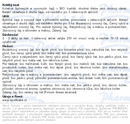 Kolekce bylinných a ovocných čajů v BIO kvalitě, vhodná třeba jako drobný dárek. Balení obsahuje 6 druhů čaje, od každého po 5 nálevových sáčcích.