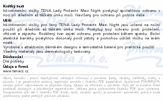 Inkontinenční vložky TENA Lady Protect+ Maxi Night poskytují spolehlivou ochranu v noci při středním až těžkém úniku moči. Navrženy pro ochranu při poloze vleže.