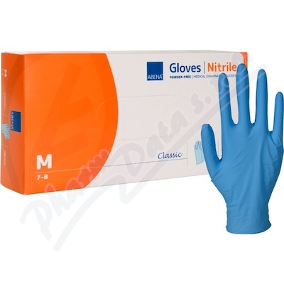 Vyšetřovací nitrilové rukavice Abena Classic, nepudrované, nesterilní. Dostupné ve velikostech S, M, L. Lze je použít pro různé úkony, jako je úklid, ošetřování, manipulace s potravinami, laboratorní práce, manipulace s léky, apod..